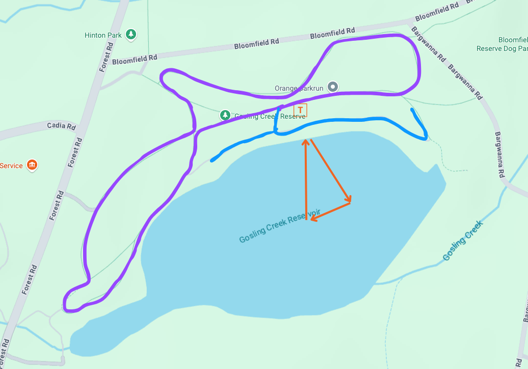 2.2km run (two large internal loops of Gosling Creek, shown in the blue line).